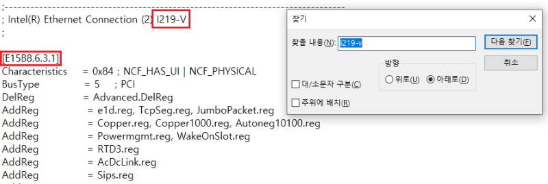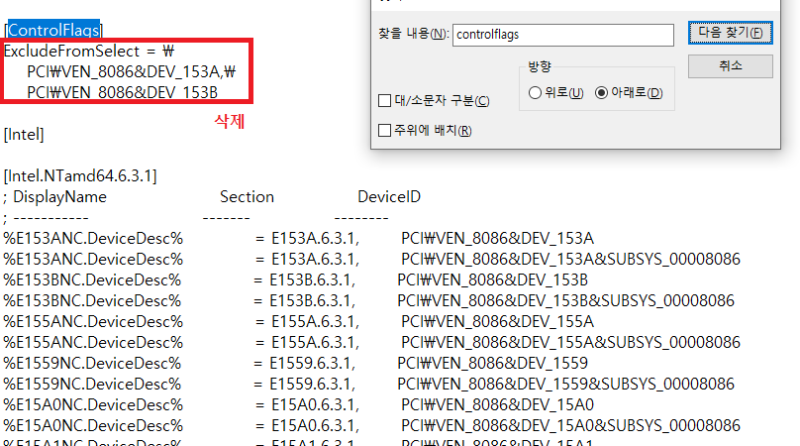 (Intel.NTamd 버전 및 관련 코드 라인 수(2-3줄)는 드라이버 버전에 따라 다를 수 있습니다.)