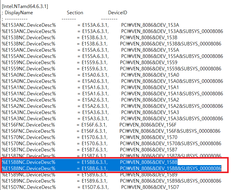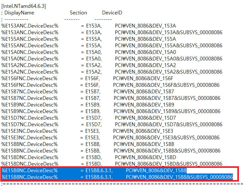 3. Intel.NTamd64.6.3.1 하단에 있는 E15B8 관련 코드 2줄을 복사 후 밑에 있는 Intel.NTamd64.6.3 에 붙여넣기