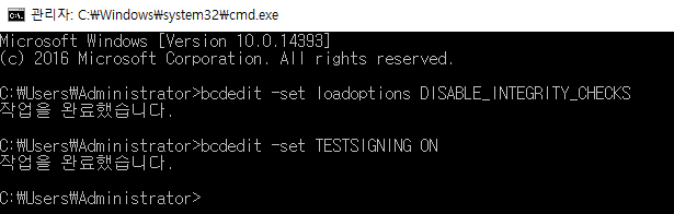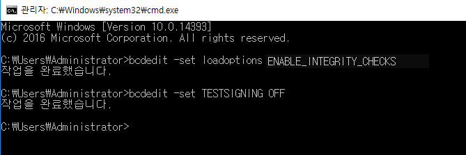 cmd 실행 후 하단 명령어로 무결성 체크 끄고 서버 재부팅