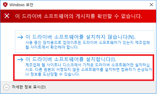 (해당 exe 파일을 그냥 실행 시 설치는 완료되나 드라이버는 안 잡힙니다.)