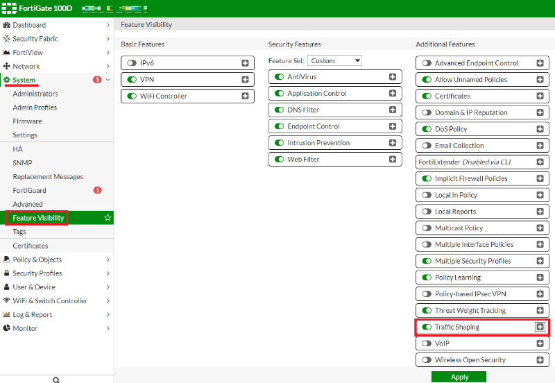 - System -> Feature Visibility 에서 Traffic Shaping 활성화