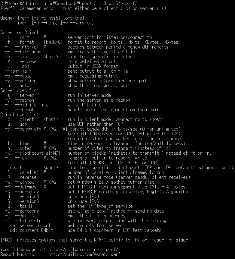 도구입니다. 트래픽을 받는 컴퓨터(server mode)와 트래픽을 보내는 컴퓨터(client mode) 양쪽에 프로그램 다운로드가 필요합니다. 윈도우 버전의 경우 설치형이 아니며 용량도 작아서 간단하게 네트워크 대역폭 측정이 가능합니다.