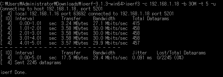 >iperf3 -c <서버IP> -b 30M -t 5 -u