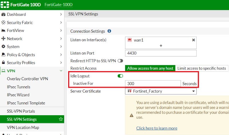 idle-timeout : SSL VPN 접속 후 특정 시간 이상 주고 받는 패킷이 없으면(유휴상태) 접속 끊김