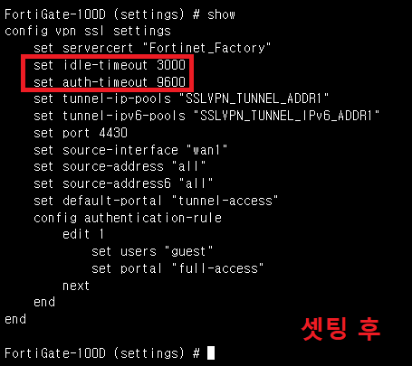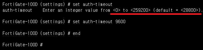 (settings)# set auth-timeout <시간> (초 단위이며 3일까지 가능, 0입력 시 auth-timeout 사용 안함)