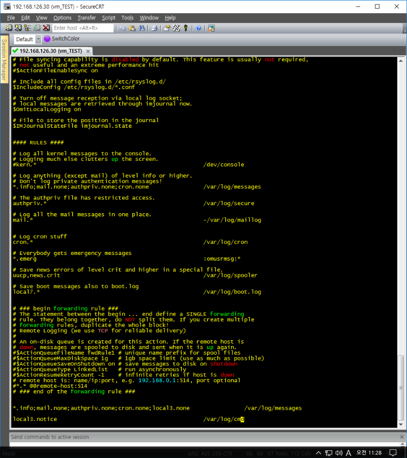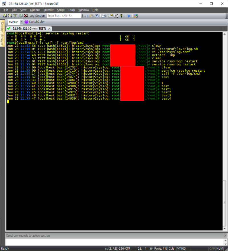 function history_to_syslog { declare command;remote=`who am i|awk '{print $5}'`;command=`fc -ln -0|sed 's/\t //'` if [ $USER == "root" ];then located="$PWD]#";else located="$PWD]$";fi if [ "$command" != "$old_command" ]; then logger -p local3.notice -t bash -i "history2syslog: $USER$remote:$located $command" fi;old_command=$command } trap history_to_syslog DEBUG 3) 별도 파일 생성을 위한 rsyslog 수정 ![]() root@localhost:[~]: vi /etc/rsyslog.conf *.info;mail.none;authpriv.none;cron.none;local3.none /var/log/messages local3.notice /var/log/cmd 4) rsyslog 서비스 재시작 및 log 확인 ![]() root@localhost:[~]: service rsyslog restart root@localhost:[~]: tail -f /var/log/cmd |