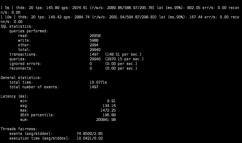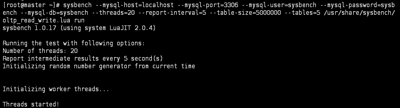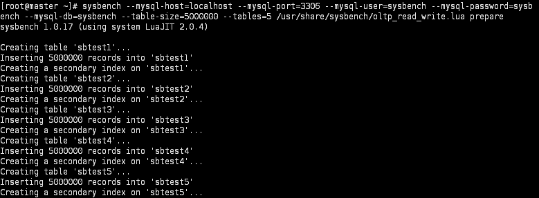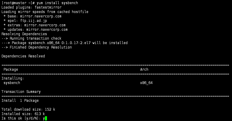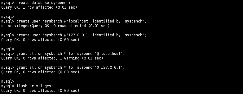 1) sysbench 설치 ![]() [root@master ~]# yum install sysbench 2) 부하 테스트용 데이터베이스 및 유저 생성 ![]() mysql> create database sysbench; mysql> create user 'sysbench'@'localhost' identified by 'sysbench'; mysql> create user 'sysbench'@'127.0.0.1' identified by 'sysbench'; mysql> grant all on sysbench.* to 'sysbench'@'localhost'; mysql> grant all on sysbench.* to 'sysbench'@'127.0.0.1'; mysql> flush privileges; 3) 테스트용 DB에 테이블 / 데이터 생성 ![]() [root@master ~]# sysbench --mysql-host=[호스트명] --mysql-port=[mysql port] --mysql-user=[DB User] --mysql-password=[DB Pass] --mysql-db=[DB명] --table-size=[각 Table별 데이터 건 수] --tables=[table 갯수] /usr/share/sysbench/oltp_read_write.lua prepare 4) read / write 테스트 실행 ![]() [root@master ~]# sysbench --mysql-host=[호스트명] --mysql-port=[mysql port] --mysql-user=[DB User] --mysql-password=[DB Pass] --mysql-db=[DB명] --threads=[테스트 thread 수] --report-interval=[중간 로그 출력시간] --table-size=[각 Table별 데이터 수] --tables=[table 갯수] /usr/share/sysbench/oltp_read_write.lua run 5) 결과 확인 ![]() 6) 테스트 데이터 삭제 ![]() [root@master ~]# sysbench --mysql-host=[호스트명] --mysql-port=[mysql port] --mysql-user=[DB User] --mysql-password=[DB Pass] --mysql-db=[DB명] --table-size=[각 Table별 데이터 건 수] --tables=[table 갯수] /usr/share/sysbench/oltp_read_write.lua cleanup |
