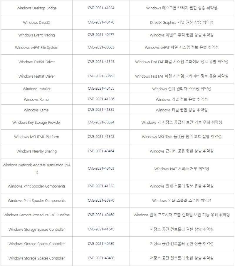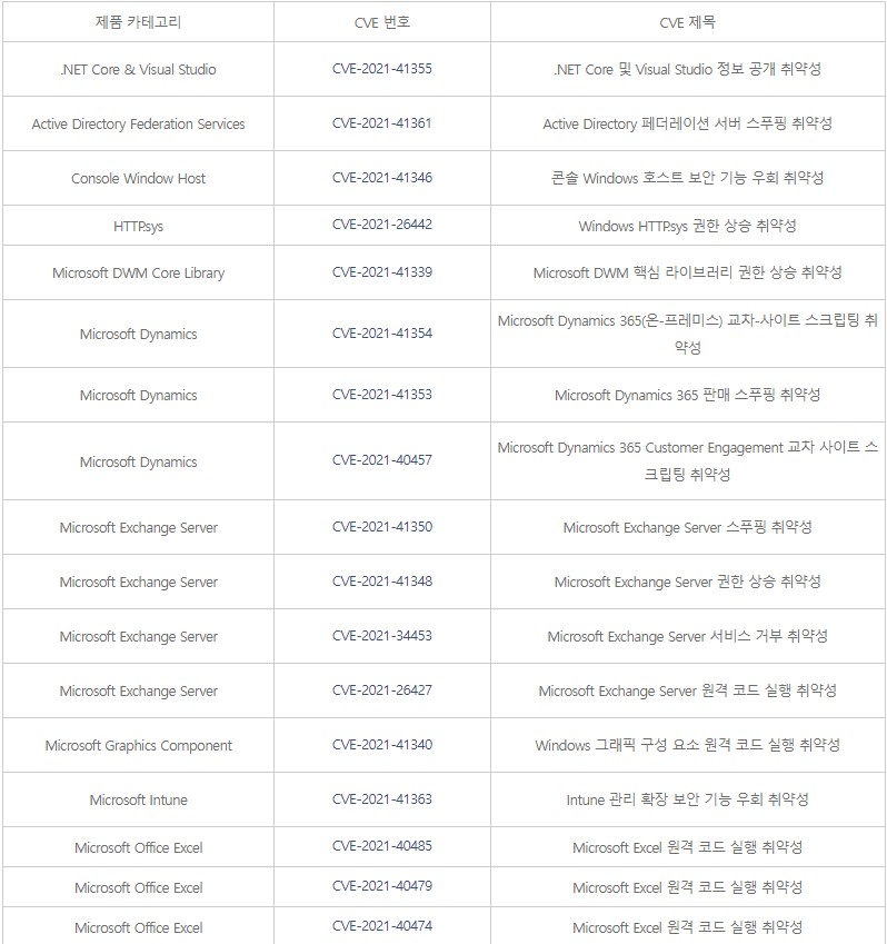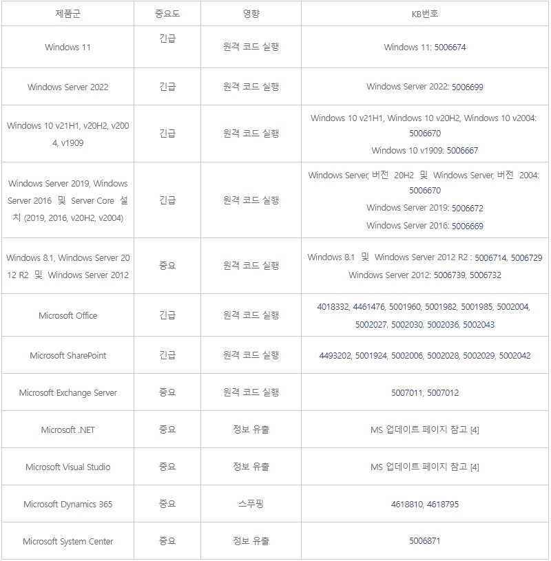 [참고 사이트] [1] (한글) https://portal.msrc.microsoft.com/ko-kr/security-guidance [2] (영문) https://portal.msrc.microsoft.com/en-us/security-guidance [3] https://msrc.microsoft.com/update-guide/releaseNote/2021-Oct [4] https://msrc.microsoft.com/update-guide o 취약점 요약 정보 ![]()