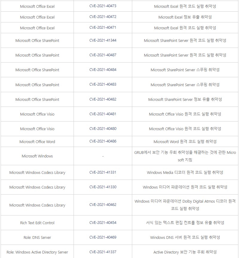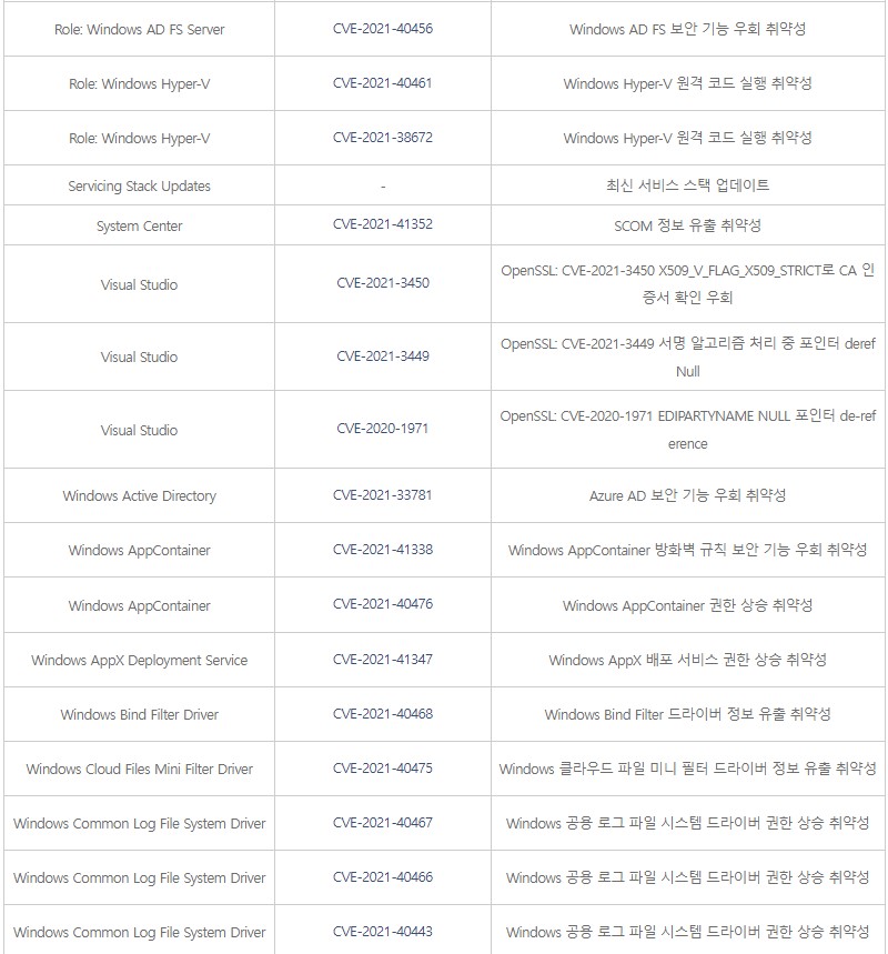 □ 10월 보안업데이트 개요(총 12종) o 등급 : 긴급(Critical) 6종, 중요(Important) 6종 o 발표일 : 2021.10.13.(수) o 업데이트 내용 ![]()
