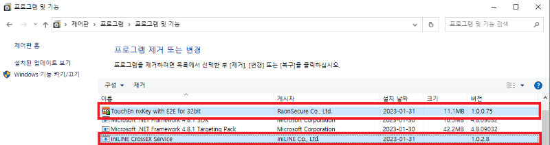 및 기능]에서 TouchEn nxKey 및 CrossEXService, Veraport V3 버전 확인 후 제거 클릭