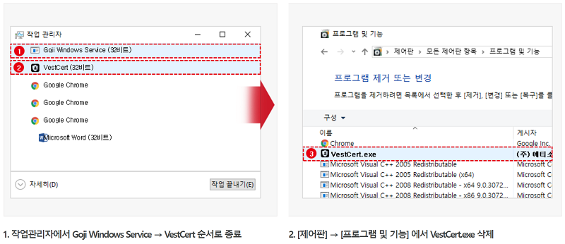 Goji → ② VestCert를 반드시 순서대로 종료 - [제어판]-[프로그램]-[프로그램 및 기능]에서
