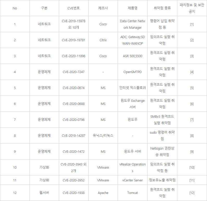 □ 개요 o `20년 보안공지 된 취약점 중 업데이트 적용에 대한 재확인이 필요한 주요 취약점 리스트 ※ 미국 NSA 발표, 랜섬웨어 유포에 악용된 취약점 등 이슈화 된 취약점 선정 □ 주요내용 ![]() ![]()