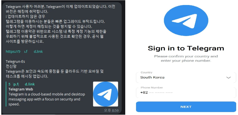 개인정보 유출과 악성앱 감염 등 2차 피해로 연계되지 않도록 사용자 주의 권고 □ 주요 내용 o 텔레그램 메신저 보안 업데이트 내용으로 속여 외부 피싱사이트 접속을 유도해 개인정보를 입력 하도록 하는
