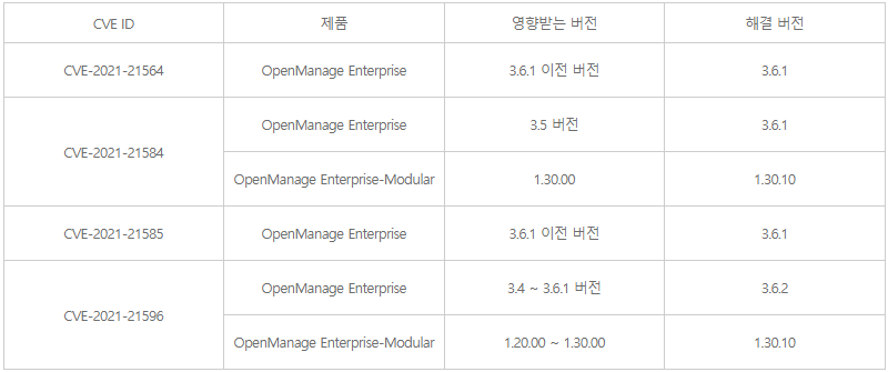 □ 설명 [1] o OpenManage Enterprise에서 부적절한 인증으로 인해 발생하는 권한상승 취약점(CVE-2021-21564) o OpenManage Enterprise 및 Enterprise-Modular에서 발생하는 정보노출 취약점(CVE-2021-21584) o OpenManage Enterprise에서 발생하는 명령어 삽입 및 실행 취약점(CVE-2021-21585) o OpenManage Enterprise 및 Enterprise-Modular에서 권한상승으로 인해 발생하는 원격코드실행 취약점(CVE-2021-21596)