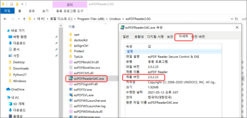 2) ezPDF Reader에 마우스 오른쪽 버튼 클릭 -> 속성 -> 자세히 탭 클릭 -> 파일 버전 확인