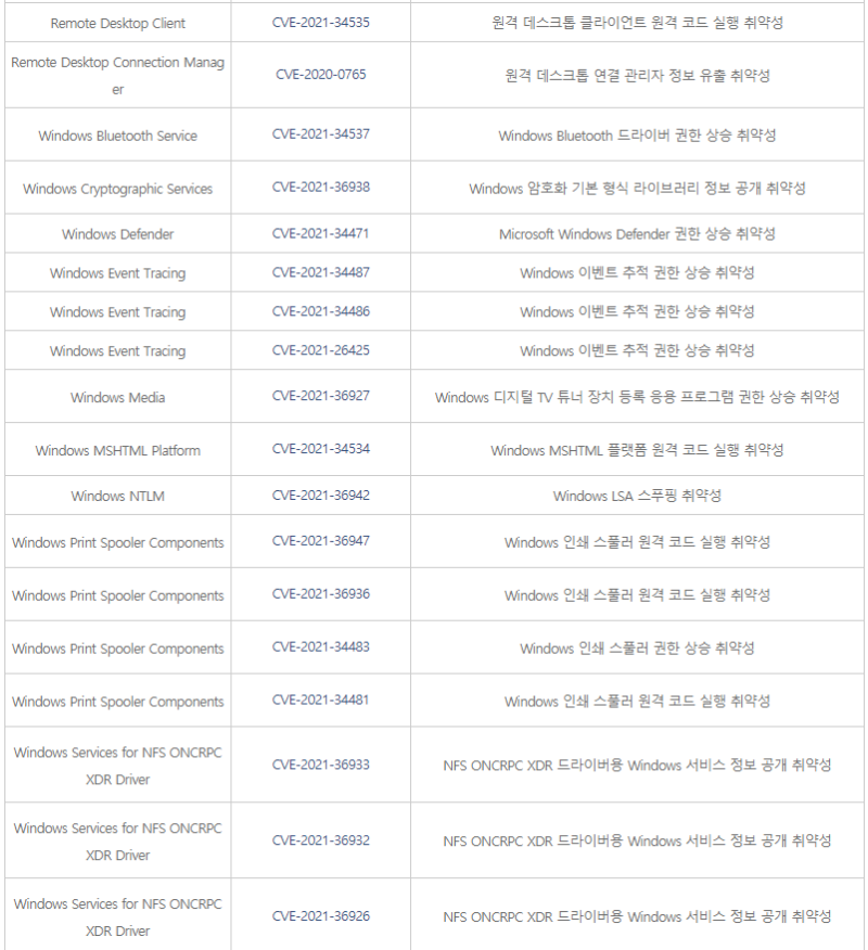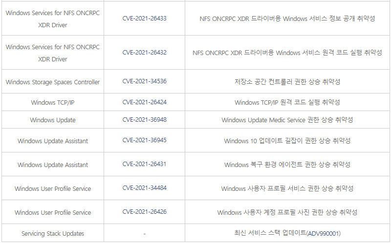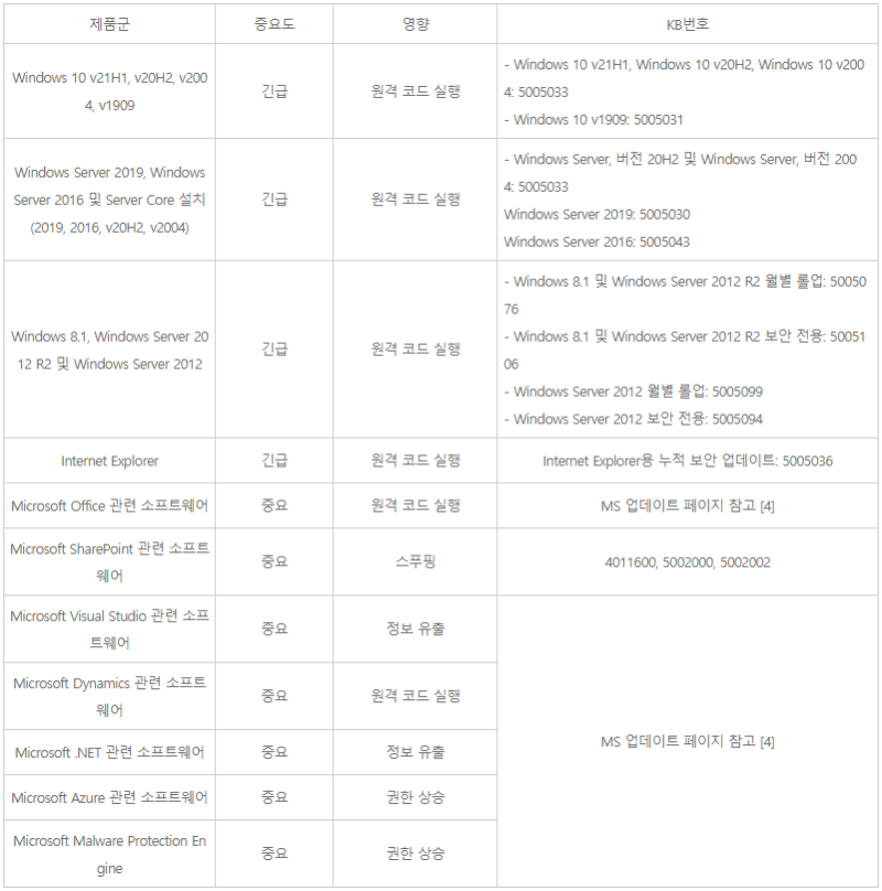 □ 8월 보안업데이트 개요(총 11종) o 등급 : 긴급(Critical) 4종, 중요(Important) 7종 o 발표일 : 2021.8.11.(수) o 업데이트 내용 ![]()