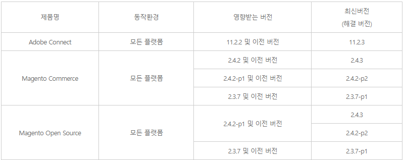 □ 영향을 받는 버전 및 제품 ![]() ※ 아래의 Adobe 참고사이트에서 “Solution”의 “Availability” 항목 참고하여 업데이트 수행 □ 기타 문의사항 o 한국인터넷진흥원 사이버민원센터: 국번없이 118