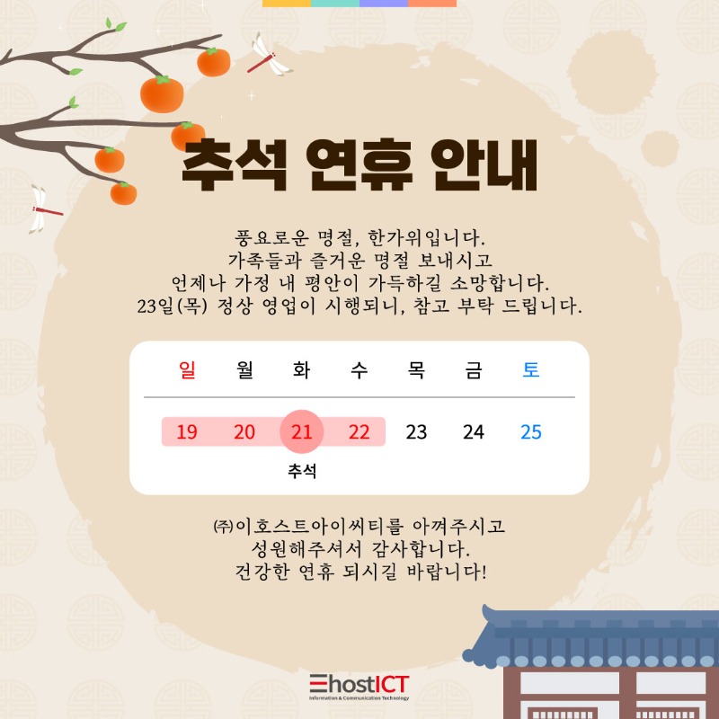 ㈜이호스트아이씨티를 아껴주시고 성원해주셔서 감사합니다. 건강한 연휴 되시길 바랍니다! |
