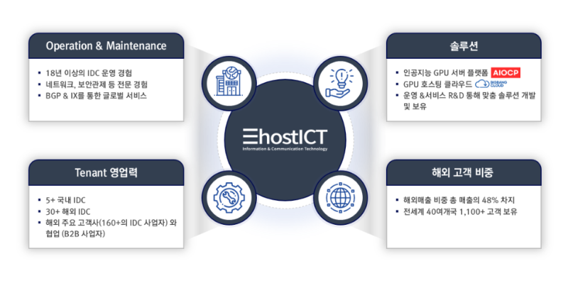 한편 이호스트ICT는 인공지능 서버 전문 브랜드 AIOCP를 통해 1:1 맞춤형 GPU 서버 호스팅서비스를 제공하고 있다. 통신인프라 부문에서는 인터넷데이터센터 구축에 애자일(Agile) 방법론을 적용, 유연하고 안정적인 전력 공급을 통한 코로케이션과 고품질의 호스팅 서비스를 제공한다. 총 20개 국에 글로벌 POP를 구축하고, 74개국 고객을 대상으로 해외 서비스를 제공 중이다. |