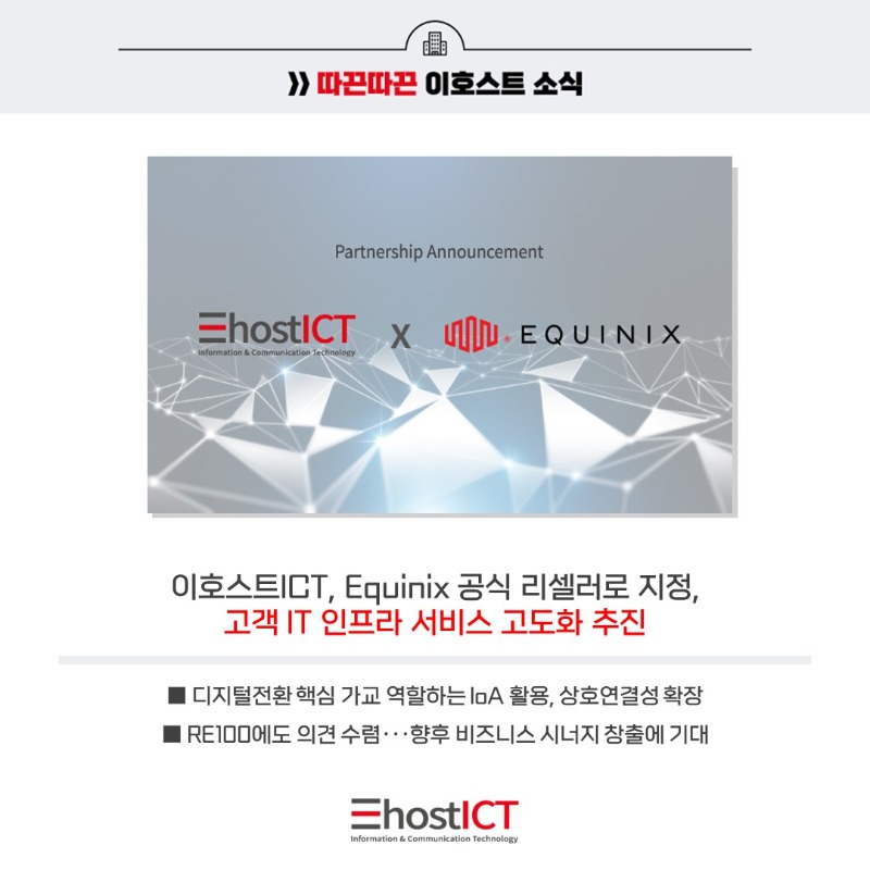 | 다음글 | 이호스트ICT, Equinix 공식 리셀러로 지정, 고객 IT 인프라 서비스 고도화 추진 |
