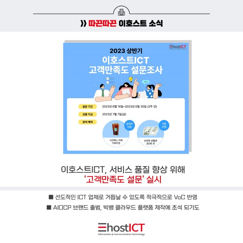 | 다음글 | 이호스트ICT, 서비스 품질 향상 위해 '고객만족도 설문' 6월까지 실시 |