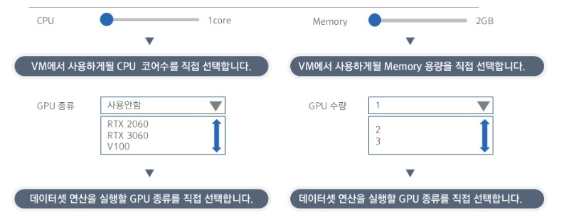 ⑤자유로운 확장 기능 -서버를 생성하거나 필요할 때 GPU, CPU, MEM, DISK 자원을 최대치 안에서 자유롭게 조절할 수 있습니다. 기본 저장 공간 외 스토리지도 추가가 가능합니다.