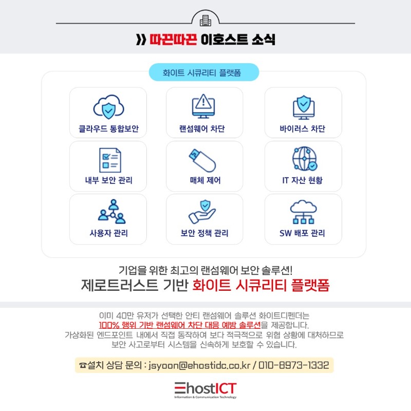 ㈜이호스트아이씨티는 백신 프로그램 및 악성코드 방어 소프트웨어을 이용하여 컴퓨터 바이러스에 의한 피해를 방지하고 있으며, 해당 소프트웨어는 매일 주기적으로 업데이트하고 있습니다.