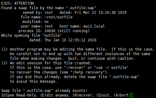 - 해결방법 2 1) 위의 메세지에서 ‘R’(복구) 을 누르거나 명령행에서 ‘vi –r outfile’ 을 입력해 복구 2) 위의 메세지에서 ‘E’(그냥 고치기) 선택 후 :recover 를 통해 복구 위 방법을 통해 복구 후 저장종료(:wq) 하고 '해결방법1'과 같은 방법으로 .swp 파일 삭제 |