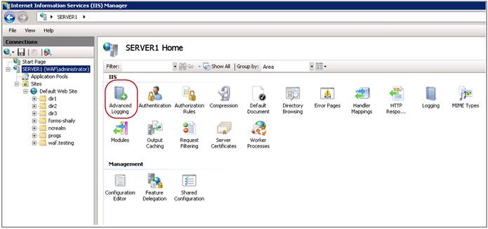 1. IIS 매니저에서 설정할 웹 서버 root 클릭 후 Advanced Logging 실행. (아래와 같이 Advanced Logging 기능이 없을 경우 Microsoft 에서 제공하는 IIS Advanced Logging 패키지 설치) DownLoad URL : http://www.microsoft.com/en-gb/download/details.aspx?id=7211 ![]() 2. 화면우측의 Action 필드 내 Enable AdvancedLogging 클릭 ![]() 3. 화면우측의 Action 필드 내 Edit Logging Fields 클릭. ![]() 4. Edit Logging Fields 내 Add Field를 클릭 후 Add Logging Field에 logging 정보 입력 ![]() 5. OK 클릭 후 추가된 필드를 확인 ![]() 6. 화면우측의 Action 필드 내 Add Log Definition 클릭. ![]()