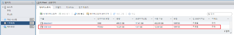 5. 파티션 포맷 및 마운트 ~#] vmkfstools -C vmfs6 -S USB-test /dev/disks/mpx.vmhba32:C0:T0:L0:1 ![]() 5-1. 스토리지 확인 ![]() |