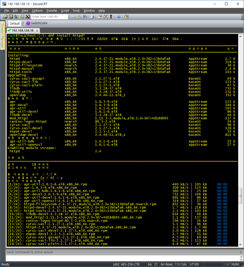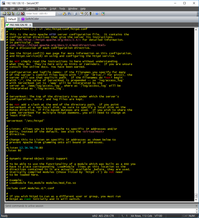 root@localhost:[~]: dnf install httpd* 2) conf파일 수정 ![]() root@localhost:[~]: vi /etc/httpd/conf/httpd.conf ServerName 192.168.126.10:80 #line 98Options FollowSymLinks #line 147AllowOverride All #line 154 DirectoryIndex index.html index.php index.cgi #line 167 ServerTokens Prod #line 167 KeepAlive On #line 168 3) httpd 활성화 및 방화벽 정책 추가 ![]() root@localhost:[~]: systemctl enable --now httpd root@localhost:[~]: firewall-cmd --add-service=http –permanent root@localhost:[~]: firewall-cmd --reload 4) html파일 생성 및 웹페이지 확인 ![]()
