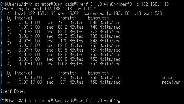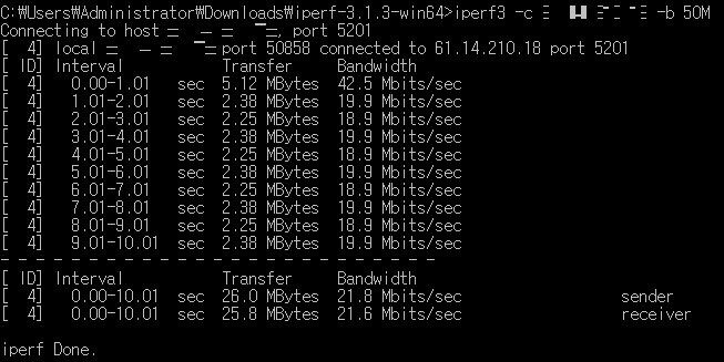도구입니다. 트래픽을 받는 컴퓨터(server mode)와 트래픽을 보내는 컴퓨터(client mode) 양쪽에 프로그램 다운로드가 필요합니다. 윈도우 버전의 경우 설치형이 아니며 용량도 작아서 간단하게 네트워크 대역폭 측정이 가능합니다.
