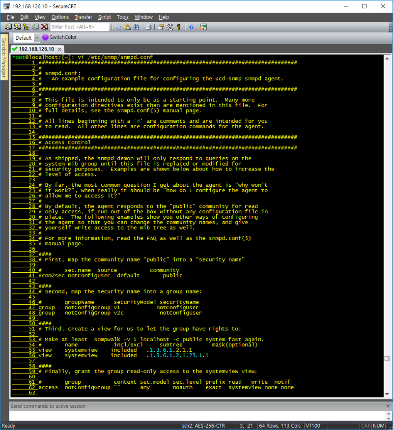 2) snmp 설정 ![]() root@localhost:[~]: vi /etc/snmp/snmpd.conf #com2sec notConfigUser default public #line 41 com2sec mynetwork IP ehost #line 74 com2sec mynetwork 192.168.126.0/24 ehost #line 75 group MyRWGroup any local #line 79 group MyROGroup any mynetwork #line 80 view all included .1 80 #line 86 access MyROGroup "" any noauth 0 all none none #line 94
