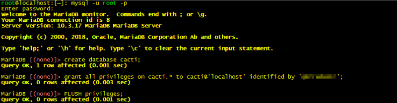 root@localhost:[~]: mysql -u root –p MariaDB [(none)]> grant all privileges on cacti.* to cacti@'localhost' identified by 'password'; MariaDB [(none)]> flush privileges; root@localhost:[~]: mysql -u cacti -p cacti < /usr/share/doc/cacti/cacti.sql