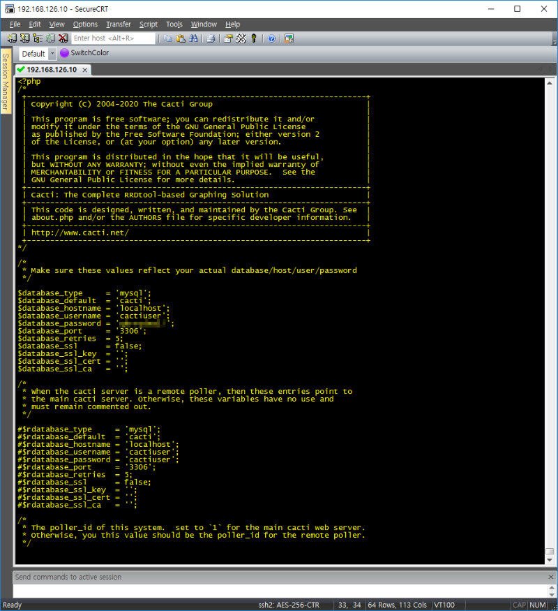 6) cacti DB환경설정 ![]() root@localhost:[~]: vi /usr/share/cacti/include/config.php $database_type = 'mysql'; #line 29 $database_default = 'cacti'; $database_hostname = 'localhost'; $database_username = 'cactiuser'; $database_password = 'password'; $database_port = '3306'; $database_retries = 5; $database_ssl = false; $database_ssl_key = ''; $database_ssl_cert = ''; $database_ssl_ca = '';