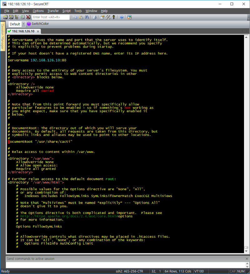 8) apache 설정 ![]() root@localhost:[~]: vi /etc/httpd/conf/httpd.conf DocumentRoot "/usr/share/cacti" #line 122