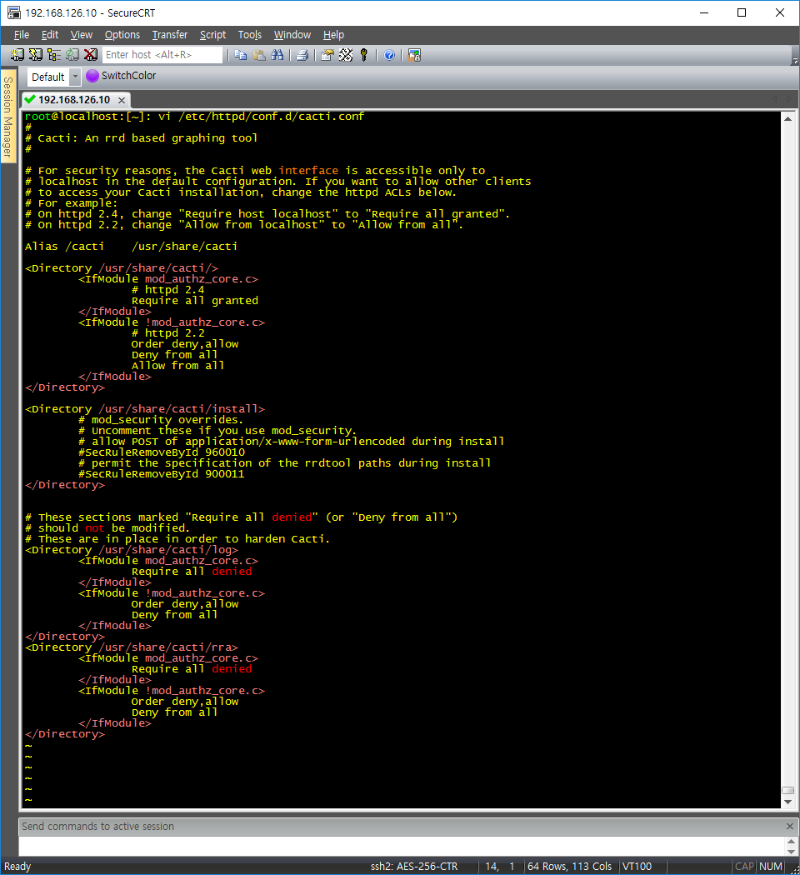 7) cacti.conf 설정 ![]() root@localhost:[~]: vi /etc/httpd/conf.d/cacti.conf # httpd 2.4 Require all granted